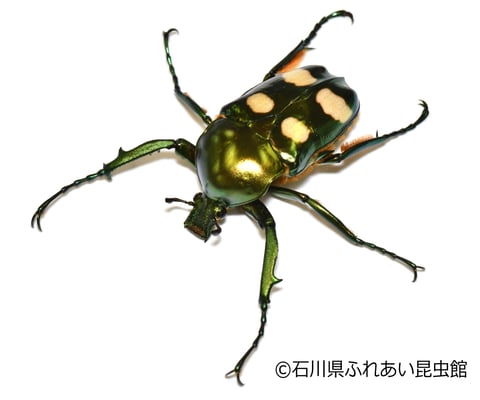 緑色の金属光沢。背中の大きな黄色い模様。長い前脚と、魅力あふれるカナブンです。