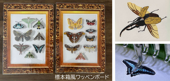東京都在住の機械刺しゅう工房 「ヒトデワークス」さんの作品を展示します。ヒトデワークスさんの作品は、様々な色の糸を使い、細部までこだわり抜かれた精巧な刺しゅうが特徴です。昆虫館の職員もその再現度の高さに驚くほどで、使用できる糸の色に限りがある中で、昆虫の模様や質感を見事に表現しています。