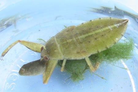 日本最大の水生昆虫で、日本最強の昆虫です。大きな前脚でつかまえられるのは小魚や昆虫だけではなく、カエルやヘビ、カメなども捕らえることがあります。