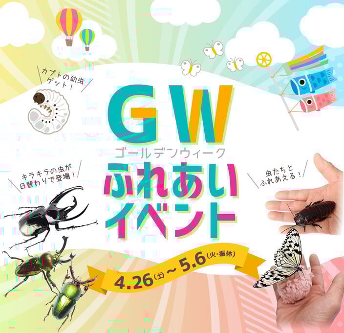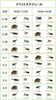ニジイロクワガタ、シロヘリミドリツノカナブン、パプアキンイロクワガタ、コーカサスオオカブト、メタリフェルホソアカクワガタ、タランドゥスオオツヤクワガタの6種の生体に「日替わり」で触れることのできるイベント。 ※4月27日よりコーカサスオオカブトは「ヘラクレスオオカブト」に変更しました |